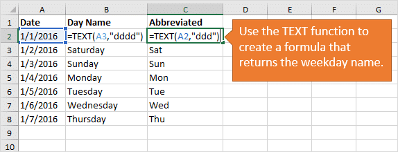 Text function takes two parameters date and format to convert date to day . This tutorial shows how to get the first day of a year through the use of excel formulas, with the date and year functions. In excel, 1 is one day and not one hour. The function will convert it into date. Let's say you have a date in cell a2 and you want to get the day name in cell b2. For example, if cell a1 contained the entry 5/1/19 . How to return a day name of the week from a date that is contained in a cell in. By subtracting this from the current date (and adding 1) we arrive at the first day of the month. The day function takes just one argument, the date from which you want to extract the day. So using this rule, we just have to subtract 1 from the formula that calculates the first day of the next month. In order to add years or to subtract years from the given date, we . In the example, the formula is: You can use dates and time in your formulas just like any other value.